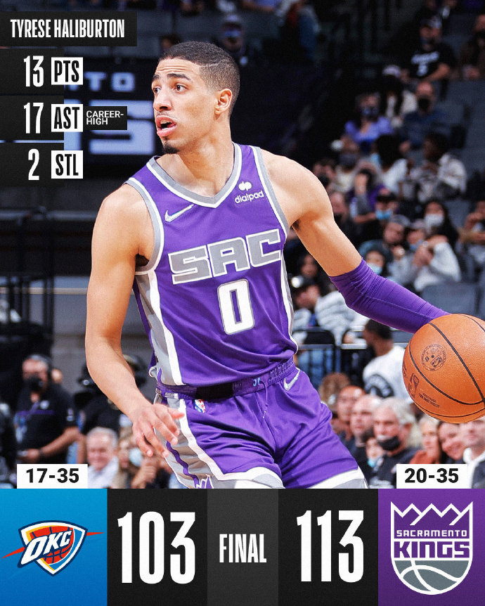 国王(20-35):巴恩斯24分9篮板5助攻3抢断、哈克莱斯18分11篮板、霍姆斯14分6篮板、米切尔17分、哈利伯顿13分6篮板17助攻、梅图9分7篮板、希尔德9分。