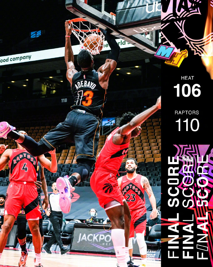 优直播2月2日讯 NBA常规赛,猛龙主场迎战热火,两队三天前曾大战三个加时,最终猛龙艰难胜出,此役双方均是背靠背作战。首节热火反客为主取得10-3的不俗开局,猛龙之后虽略有复苏无奈防守不给力,热火很快取得了两位数的领先,次节阿丘瓦、特伦特等人轮番发威,几次将分差缩小到个位数,无奈节末阿德巴约大发神威连得6分,热火在半场结束时依旧保有12分的优势。第三节范弗里特终于复苏,他一人连砍11分带队打出一波14-3瞬间迫近比分,可惜球队罚球命中率不高错失了扳平的机会,热火靠着阿德巴约与巴特勒的强攻勉强维持住优势,末节西亚卡姆、阿丘瓦、特伦特三分如雨,猛龙一波10-0终于反超比分,纵使希罗此后带队连续追分却为时晚矣,阿奴诺比空接上篮杀死比赛。最终,猛龙110-106逆转击败热火取得三连胜。