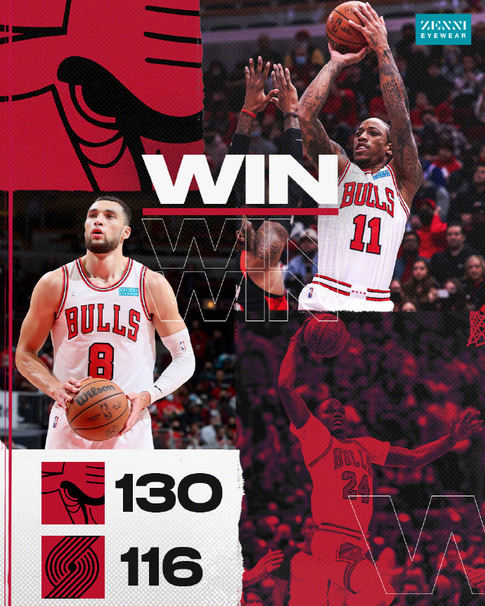 公牛(31-18):德罗赞23分4板10助2断,武切维奇24分14板3助,拉文20分4助,怀特18分6助,格林16分3板,布拉德利10分6板3断,托马斯9分2板,道苏姆7分6板11助2断。