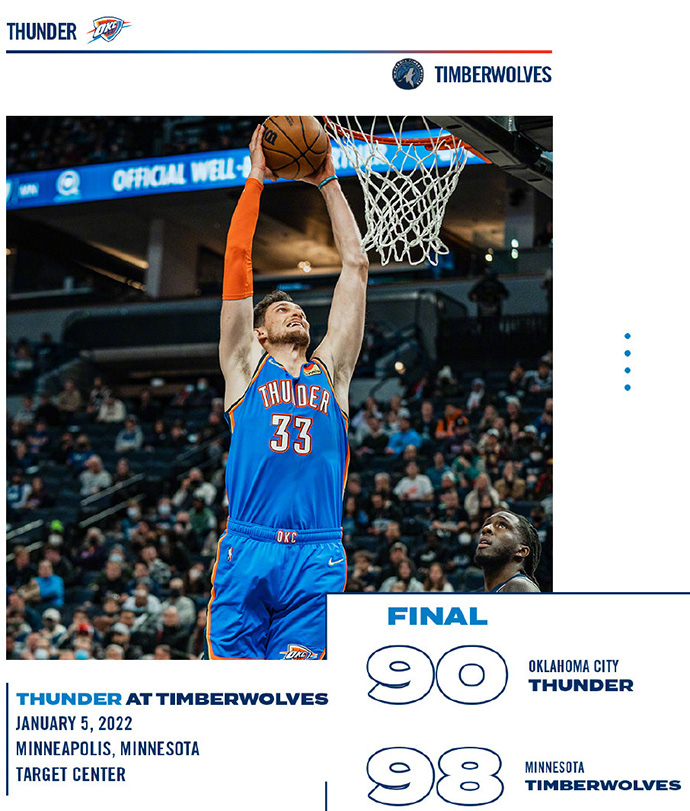 优直播01月06日讯 NBA常规赛继续进行,雷霆客场挑战森林狼。雷霆本赛季依旧以锻炼和培养新人为主,亚历山大和多特都有了长足的进步。森林狼目前位居西部第九,但距离第五的掘金也只有2个胜场差,在本赛季多队受到疫情影响的情况下,森林狼有机会趁乱杀入季后赛。唐斯、拉塞尔、亚历山大本场均迎来复出。一开场,雷霆全队梦游,失误打铁不断,贝弗利连中三分帮助森林狼取得两位数领先。雷霆单节出现10次失误,森林狼多点开花领先20分结束首节。次节比赛,雷霆迅速回暖,强攻篮下频频得手,将分差迫近到个位数,森林狼连中三分稳住局势,半场战罢森林狼49-36领先。易边再战,贝弗利先中两个三分,后半段雷霆奋力反击,打出10-0将分差缩小到个位数。三节打完森林狼领先6分。第四节,雷霆内外开花继续缩小分差,一度将分差缩小到7分。诺威尔挺身而出连得7分稳住局势,贝弗利也连投带罚拿到4分,森林狼力克雷霆取得胜利。