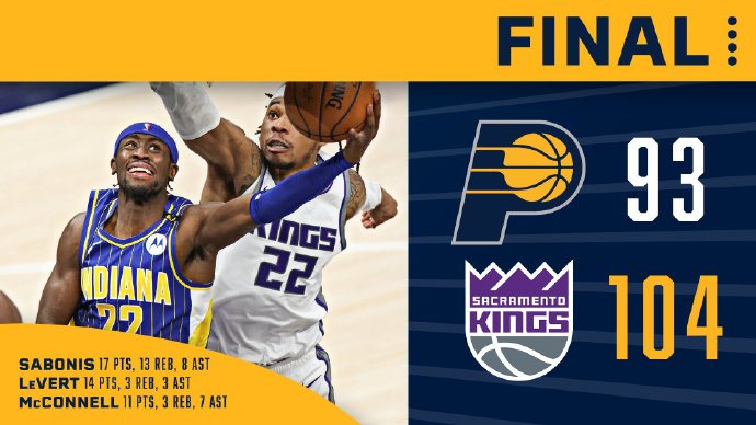 步行者(30-35):萨博尼斯17分13篮板8助攻,布里塞特8分3篮板,麦克德莫特11分5篮板,阿隆-霍勒迪5分4助攻,勒韦尔14分3篮板3助攻,贾斯丁-霍勒迪8分3篮板,比塔泽5分6篮板2助攻,麦康纳11分3篮板7助攻3抢断,凯勒-马丁11分6篮板2助攻,卡修斯-斯坦利3分3篮板