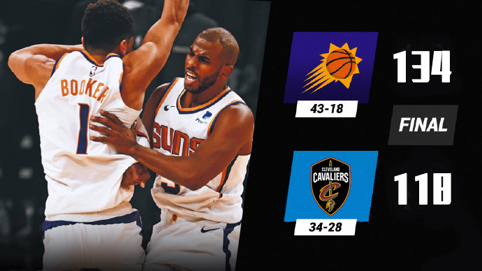 优直播5月5日讯 NBA常规赛太阳对阵骑士,近来太阳取得4连胜仍旧紧追爵士排在西部第二,骑士则是遭遇6连败。开场后布克就展现出火热手感,他一人独得11分,但骑士多点开花反而取得领先,不过佩恩和萨里奇替补登场后发挥出色帮助太阳反超比分。第二节回来骑士首先外线开张,保罗逐渐找到状态,他除了自己砍分还不停为队友送出助攻,上半场太阳59-53领先骑士。下半场回来骑士仍旧率先外线发力,不过在艾顿的发挥下太阳一度领先到两位数,但多特森和塞克斯顿两人联手掀起反扑帮助骑士追平比分。第四节场上局面仍旧胶着,保罗带领太阳始终保持略微优势。最后阶段奥科罗连续强硬突破帮助骑士将比赛拖入加时。加时赛中骑士突然断电,太阳一波15-0的攻势直接拉开比分锁定胜局,最终太阳加时134-118拿下骑士取得5连胜,骑士遭遇7连败。