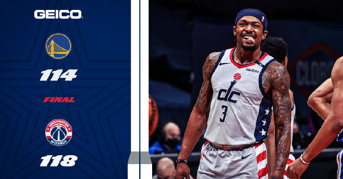 优直播4月22日讯 今日NBA常规赛,勇士客场挑战奇才,勇士过去8战6胜,而奇才目前也已经取得5连胜。比赛开始后,奇才率先找到进攻节奏,打出一波11-0进攻高潮取得领先,勇士连续出现失误而且投篮接连打铁,首节比赛奇才38-20领先勇士18分。第二节比赛开始后,奇才进攻效率降低陷入得分荒,勇士抓住机会开始发起反击,连续打出进攻高潮将比分缩小至只剩2分。下半场比赛开始后,奇才连得7分将将领先优势扩大至9分,之后勇士开始发力,勇士里突外投打出一波13-0将比分迅速,三节战罢,勇士93-86反超奇才7分。最后一节,勇士外线将领先优势扩大至9分,奇才不断冲击勇士内线缩小比分,双方分差一度只剩一分,最后奇才连续突入内线将比分反超,最后奇才118-114力克勇士。
