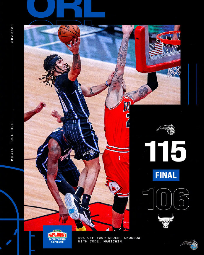 优直播4月15日讯 NBA常规赛,公牛主场迎战魔术。公牛近期遭遇了三连败,目前排在东部第十,领先身后的球队仅两个胜场。魔术更是遭遇了六连败,排名仅高于活塞,列东部倒数第二。一开场,双方均很快进入状态,连续投篮命中,魔术多点开花,领先10分结束首节。次节初段魔术延续火力继续保持领先,后半段公牛突然发力,一波12-3将半场分差缩小到1分。易边再战,武切维奇里突外投帮助公牛咬住比分,无奈魔术火力全开连中四个三分,三节打完魔术领先21分。末节争夺,公牛如梦方醒,拉文连续三分将分差缩小到个位数,恩尼斯三分杀死比赛。最终,魔术客场战胜公牛,结束六连败的同时送给对手四连败。