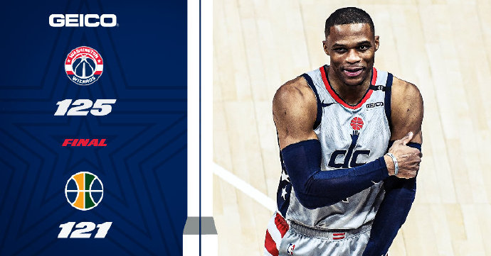 奇才(20-33):比尔34分3篮板5助攻,威斯布鲁克25分14篮板14助攻,贝尔坦斯10分4篮板,加福德15分4篮板,洛佩兹10分,史密斯9分2助攻,内托7分2助攻。