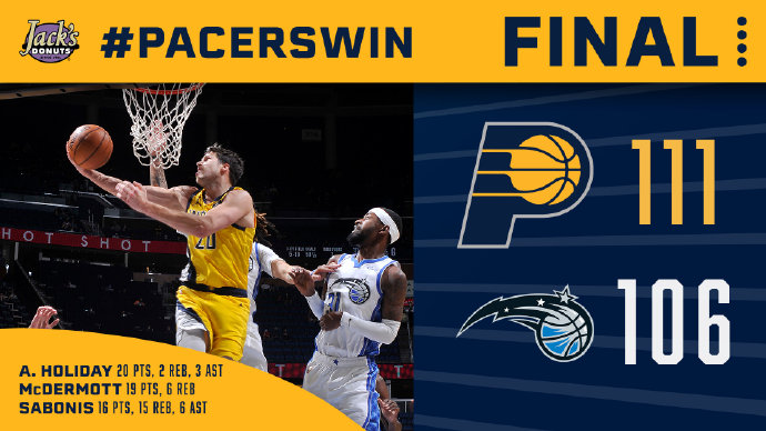 优直播4月10日讯 今日NBA常规赛,步行者客场挑战魔术,加里-哈里斯首次代表魔术出战,萨博尼斯与布罗格登本场比赛迎来复出。比赛一开始,双方比分便陷入胶着,魔术连突内线取得领先,步行者则内外兼修始终紧咬比分,随着节末A-霍勒迪连续甩进两记三分,步行者领先魔术3分结束首节。第二节比赛后半段,魔术陷入得分荒,接连多次投篮打铁,步行者抓住机会打出一波11-0将比分扩大,半场结束64-51领先13分。易边再战,步行者进攻效率降低,魔术里突外投不断得分一度将分差缩小至3分,随着麦康纳压哨抛投得手,三节战罢,步行者83-78领先魔术5分。末节开始,步行者里突外投不断扩大领先优势,分差一度来到15分,魔术多次尝试反扑,但分差太大最终无力回天,步行者客场111-106战胜魔术。