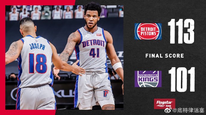 优直播4月9日讯 NBA常规赛,国王今日迎战活塞,前者四连败后排在西部第十二位,而后者上场比赛则是输给了掘金,继续在东部垫底,本场格兰特、普拉姆利和巴格利等人缺战。比赛上来两队便陷入拉锯战,场上比分交替领先,首个暂停之后活塞逐渐取得场上的微弱领先,在进入次节后活塞完全占据场上主动,分差也一度达到了二十分,半场结束时场上分差为18分。易边再战,国王多次发起反扑攻势,分差最小时仅剩7分,不过却始终没能更进一步,最终活塞力克国王送给后者五连败。