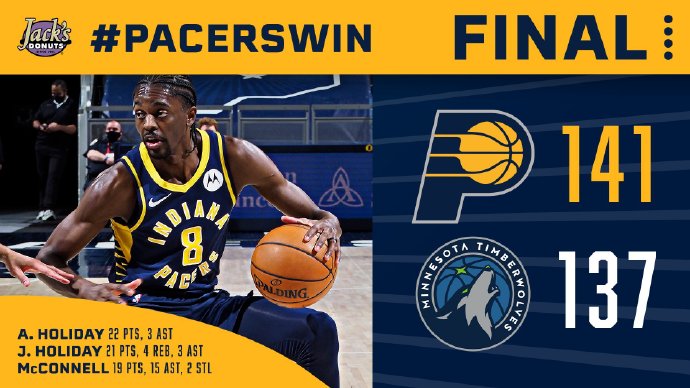 优直播4月8日讯 今日NBA常规赛,步行者主场迎战森林狼,本场比赛步行者小萨博尼斯在内的多名主将缺战。比赛开始后,双方便进入对攻模式,森林狼内外兼修,而步行者则不断冲击内线始终紧咬比分,随着马丁反击断球打成二加一,步行者领先4分结束首节。次节回来后,森林狼进攻效率降低,连续投篮打铁,步行者则多点开花,抓住机会一度将分差扩大至21分。下半场回来后,森林狼找回进攻状态,唐斯里突外投连续得分,步行者则稳扎稳打始终保持十分以上领先优势,三节战罢,步行者109-94仍然保持15分领先。最后一节,爱德华兹率先发力连得7分,步行者外线发力接连命中3记三分,依靠外线火力浇灭森林狼反扑势头,最后时刻,麦康纳弧顶甩进压哨三分杀死比赛。最终,步行者141-137战胜森林狼捍卫主场。