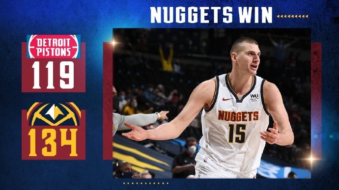 优直播4月7日讯 NBA常规赛掘金主场对阵活塞,戈登加盟掘金后如鱼得水,掘金也是取得5连胜佳绩,开场后活塞首先进入状态取得领先,不过随着约基奇开始发力,他带领掘金追上并反超比分。第二节掘金延续进攻状态,他们多点开花将分差拉大到两位数,虽然活塞一度通过反击缩小分差,但约基奇又带领掘金掀起高潮在上半场结束时以76-56领先到20分。下半场虽然活塞多次通过外线三分追分,但掘金始终保持不错进攻状态,最终掘金134-119轻松击败活塞取得6连胜。