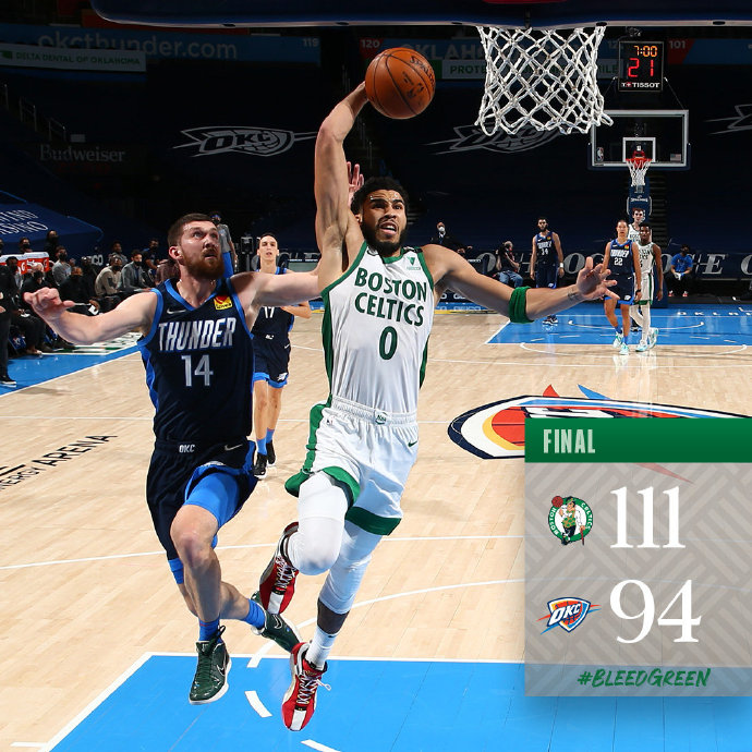 优直播3月28日讯 NBA常规赛,雷霆今日迎战凯尔特人,前者上场比赛输给了灰熊排在西部第十三位,而后者上场比赛则是战胜了雄鹿,暂列东部第七位,本场亚历山大、霍福德和沃克等人缺战。比赛上来多特就表现出了火热的状态,个人连拿八分帮助雷霆取得领先,凯尔特人首发的糟糕表现让分差逐渐达到了两位数,好在是替补球员上来后迫近比分,次节双探花终于回暖一度追平比分,但一直未能实现反超,半场结束时雷霆领先5分。易边再战,凯尔特人依旧被对手压制,不过到了末节雷霆突然开始不得分,前六分钟仅靠罚球拿到两分,凯尔特人终于把握住机会打出一波19-0的攻势直接反超并建立起两位数的领先优势,比赛就此失去了悬念,最终凯尔特人逆转雷霆获得连胜。