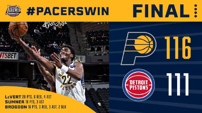 优直播3月24日讯 步行者主场迎战东部“副班长”活塞,目前步行者排名东部第10,距离第8的凯尔特人还有1.5个胜场,此役他们也是势在必得。首节步行者在打了一波8-0攻势后进攻突然断电,活塞抓住机会在艾灵顿的带领下回敬一波13-2将比分反超,次节两队开始三分对飚大战,比攻击火力显然还是步行者的火力更猛,布罗格登、勒韦尔先后开张掀起个人得分秀,步行者单节净胜9分反超比分。第三节,步行者一度将分差拉大到两位数,然而活塞却在萨迪克-贝和格兰特的率领下打出13-3的小高潮迫近比分,末节萨迪克-贝的三分让活塞一度完成反超,此时步行者的角色球员萨姆纳连得12分带领球队度过难关,之后萨博尼斯和勒韦尔又相继爆发,活塞虽竭力追赶却在最后时刻出现失误,勒韦尔大心脏三分杀死比赛,最终步行者主场111-106击败活塞。