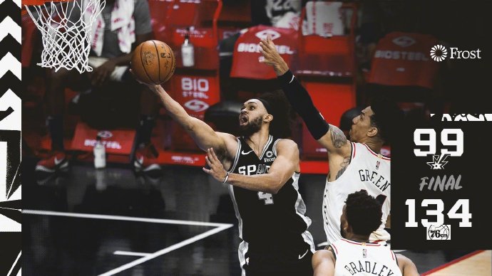优直播3月15日讯 NBA常规赛继续进行,76人主场迎战马刺。76人目前高居东部第一,球队也在上一场比赛中大胜奇才取得四连胜,但当家球星恩比德的受伤给胜利蒙上了一层阴影,好在恩比德此次伤病并不严重,据消息称2-3周后即可复出。马刺目前位列西部第七,阿尔德里奇已和球队达成协议不再出战,德罗赞也因个人事务缺阵。本场西蒙斯迎来复出。一开场,面对旧主的丹尼-格林毫不手软,4投全中独得11分,帮助76人领先11分结束首节。次节比赛马刺奋力反击一度把分差缩小到4分,西蒙斯连续得分帮助球队稳住局势,半场打完76人60-52领先马刺8分。易边再战,76人火力全开,马刺无力招架,波波维奇五上五下也于事无补,马刺完全被打散,76人单节拿到46分,领先33分进入末节。末节彻底沦为垃圾时间,但76人势头不减三分连续命中,最终76人主场大胜马刺,喜获五连胜。