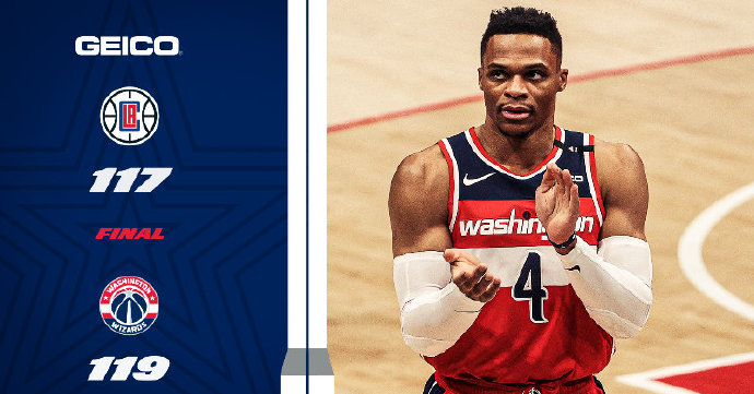 奇才:威斯布鲁克27分9篮板11助攻4断,比尔33分7篮板3助攻2断,八村塁9分3篮板,瓦格纳12分3篮板3断,贝尔坦斯11分4篮板,罗宾-洛佩兹10分7篮板3助攻,内托11分;