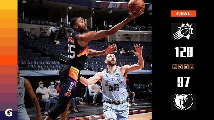 优直播2月21日讯 NBA常规赛太阳对阵灰熊,灰熊近来状态不错取得2连胜。开场后两队进入状态都比较慢,不过太阳逐渐在外线找到手感依靠一阵三分雨取得领先。第二节灰熊手感仍旧平平,但是太阳外线多次三分雨下不断拉大分差,上半场打完,太阳65-34遥遥领先。下半场回来虽然灰熊在进攻端找到手感,但太阳手感火热仍旧不断拿分,灰熊完全无法限制太阳缩小分差,最终太阳128-97大胜灰熊。