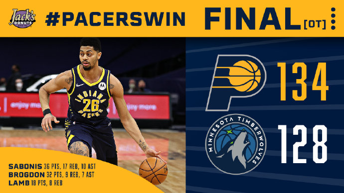 步行者:萨博尼斯36分17篮板10助攻3抢断、布罗格登32分9篮板7助攻、麦克德莫特8分2篮板、贾斯汀-霍乐迪11分9篮板4助攻、特纳8分2篮板4盖帽、兰姆18分8篮板、麦康纳6分6助攻、阿隆-霍乐迪15分3篮板2助攻