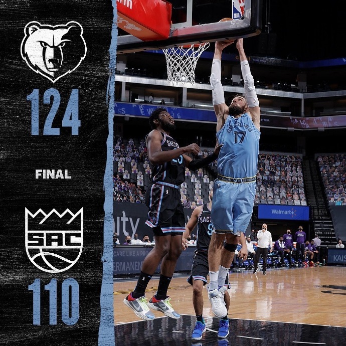 灰熊(11-11):莫兰特16分10助,布鲁克斯22分3板2助2断,安德森17分6板4助4断,瓦兰丘纳斯25分12板,阿伦10分4板3助,蒂尔曼12分5板,克拉克13分4板4助,康查尔7分