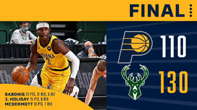 优直播2月4日讯 NBA常规赛雄鹿主场迎战步行者,开场后雄鹿外线手感不错多次命中三分取得领先,第二节两队仍旧大打对攻战,雄鹿逐渐将分差拉大到20分开外,萨博尼斯发力帮步行者略微缩小分差,上半场,雄鹿68-51领先步行者。下半场回来步行者进攻不力只有布罗格登和萨博尼斯两人能够拿分,但雄鹿攻势凶猛多点开花将分差拉大到30分以上,虽然步行者第四节追回些分数,但此前分差过大,最终雄鹿130-110轻松击败步行者取得2连胜。
