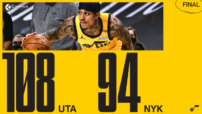 优直播1月27日讯 爵士坐镇主场迎战尼克斯,上半场尼克斯杀出奇兵,替补上场的小里弗斯里突外投独砍25分,率领尼克斯在半场战罢以59-46建立起两位数领先。易边再战,爵士找到手感,康利、博格丹诺维奇和米切尔等连中三分,爵士凭借这波三分雨抹掉分差。末节爵士延续手感火热手感,奥尼尔等连续得分,帮助球队反超比分。而尼克斯则命中率暴跌,整个下半场仅得到35分。最终,爵士以108-94逆转尼克斯,豪取9连胜,同时送给尼克斯3连败