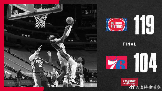 优直播1月26日讯 NBA常规赛活塞对阵76人,活塞近来状态不佳遭遇4连败,76人则是在3连胜后暂时登顶东部榜首,但是恩比德这场比赛继续缺阵。开场后活塞在外线就展现出火热手感,他们连续投进三分早早取得两位数优势,第二节76人掀起反扑缩小分差,活塞通过罚球再次拉开比分,艾灵顿和库里对飚得分,上半场活塞64-50领先。下半场回来格兰特连续投篮命中,哈里斯也接连得分回应,布拉德利也通过努力拼抢为76人追分,但活塞总能及时命中三分稳住节奏,76人始终无法追上比分,最终活塞119-104击败76人结束4连败。