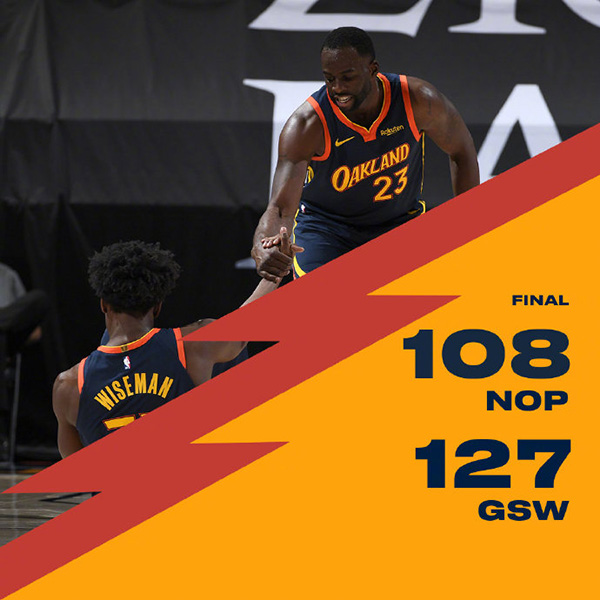 勇士:维金斯13分5篮板2助攻3盖帽、格林4分4篮板6助攻、怀斯曼15分5篮板2盖帽、乌布雷5分2篮板、库里24分7篮板7助攻、普尔10分3篮板4助攻2抢断、里9分、帕斯卡尔4分2助攻、沃纳梅克3分、曼尼恩8分4助攻