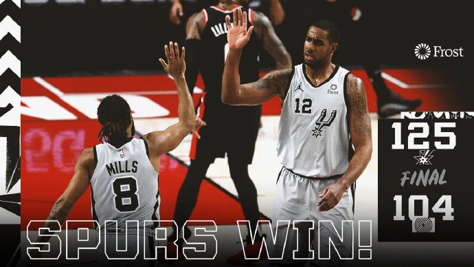 优直播1月19日讯 NBA常规赛马刺客场挑战开拓者,麦科勒姆因伤缺阵。开场后阿尔德里奇就在中距离频频拿分,不过首发出战的胡德也是手感火热,两队多次打成平手,第二节米尔斯替补登场后手感火热,虽然开拓者也接连回敬,但马刺仍旧逐渐扩大优势。但此后开拓者掀起反扑缩小分差,上半场打完,马刺59-54领先开拓者。下半场回来阿尔德里奇再次中距离连续投进,利拉德带领开拓者一度完成反超,不过马刺依靠拼抢前场篮板稳住阵脚,第四节上来盖伊和米尔斯就连中三分拉开比分,虽然开拓者一度用三分回应,但盖伊手感火热,尽管利拉德努力追分但于事无补,最终马刺125-104轻松拿下开拓者。