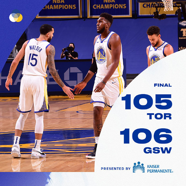 优直播1月11日讯 勇士坐镇主场迎战猛龙,此役猛龙采用多人包夹库里的防守策略,但是勇士的维金斯、格林和李等站出来提供火力支援,勇士得以破解猛龙的防守,在前三节建立起15分领先。不过,勇士在末节未能延续火力,猛龙的洛瑞则突然爆发,他频频命中三分并强突得手,率领猛龙打出高潮成功反超比分。关键时刻,李成功造洛瑞犯规两罚全中,勇士反超1分,留下4.3秒给猛龙。最后一攻,西亚卡姆翻身跳投出手不中,猛龙以105-106惜败。