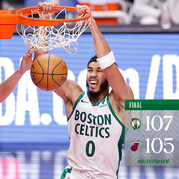 优直播1月7日讯 NBA常规赛热火再战凯尔特人,开场后凯尔特人依靠外线火热手感取得领先,不过巴特勒带领热火紧追比分,第二节两队进攻手感下降多次打铁,单节两队打成19平,上半场结束凯尔特人53-45领先。下半场回来热火外线三分雨下追上比分,随后巴特勒帮助热火完成反超,接着两队陷入胶着,最后一节开始热火一度取得领先,不过最后时刻热火断电,凯尔特人再次建立领先,最后时刻热火3个三分追平比分,但是普理查德补篮完成绝杀,最终凯尔特人107-105扑灭热火。
