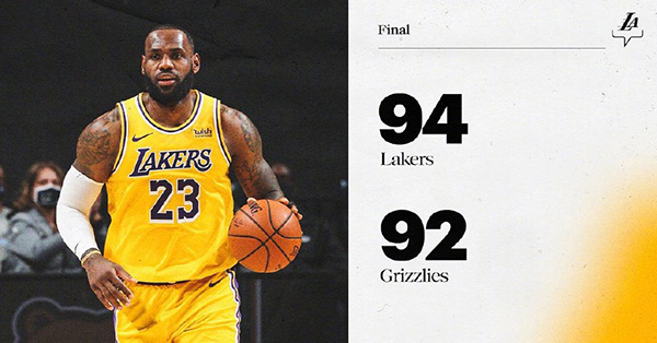 优直播1月6日讯 NBA常规赛湖人对阵灰熊,湖人近来状态不错取得3连胜。开场后湖人利用快攻抢占先机,首节两队手感都比较一般,灰熊冲击内线追上比分,吉昂和蒂尔曼帮助球队完成反超。第二节上来湖人外线连中三分,接着场上局面陷入僵持,两队球队轮番打出表现,上半场结束时灰熊49-45领先湖人。下半场两队两队手感仍旧一般,詹姆斯一度帮助湖人反超比分,不过灰熊及时调整咬住比分,第四节场上局面仍旧胶着,最后关头詹眉两人先后发力在攻防两端帮助湖人锁定胜局,最终湖人力克灰熊取得4连胜。