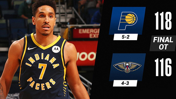 优直播1月5日讯 NBA常规赛步行者客场挑战鹈鹕,开场后依靠外线更加火热的手感鹈鹕先取得领先,不过步行者多点开花反超比分,第二节双方你来我往打得势均力敌,上半场步行者53-51领先。下半场回来锡安和亚当斯先是在内线发力,不过萨博尼斯马上强势回应,接着步行者外线开花继续保持领先,不过第四节鹈鹕发力完成反超,但他们在最后关头掉线被步行者连追10分拖入加时。加时赛中鹈鹕主要依靠英格拉姆得分,特纳和奥拉迪波帮助步行者取得领先,布罗格登完成准绝杀,鹈鹕最后一攻无果,最终步行者加时118-116力克鹈鹕。