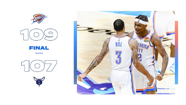 优直播12月27日讯 NBA常规赛雷霆客场挑战黄蜂,这是雷霆新赛季第一场正式比赛。开场后两队就打得个势均力敌,鲍尔一扫上场比赛颓势在首节就表现不错,第二节格拉汉姆突然爆发帮助黄蜂一度领先到11分,但是希尔和亚历山大帮助雷霆追上比分,半场打完,黄蜂59-57领先雷霆。下半场回来黄蜂进攻乏力,虽然雷霆进攻也比较一般但仍旧完成反超,最后一节雷霆依靠三分线外的不错手感将领先巩固在两位数,但是最后时刻布里奇斯三个三分帮助黄蜂在9.7秒的时候追平比分,亚历山大晃开防守跳投命中,最终雷霆109-107击落黄蜂取得赛季开门红。
