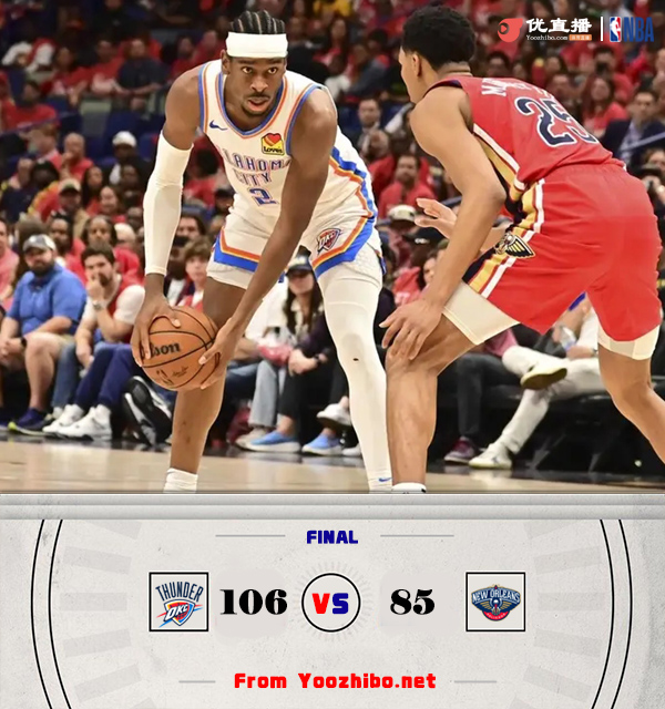 优直播4月28日讯 NBA季后赛,雷霆客场挑战鹈鹕。目前总比分雷霆2-0领先。比赛开始,双方开场势均力敌,比分交替领先,雷霆内外开花占据主动,次节前半段双方依旧缠斗,此后雷霆突然发力,三分4连击将分差拉开到两位数,半场战罢雷霆60-46领先14分。易边再战,雷霆牢牢占据场上主动,又是三分3连击扩大优势,鹈鹕强攻内线拿分苦苦支撑,末节雷霆持续发力打出10-2将分差拉开到20分以上,鹈鹕大势已去无力回天。最终,雷霆106-85再胜鹈鹕,总比分3-0领先拿到赛点。