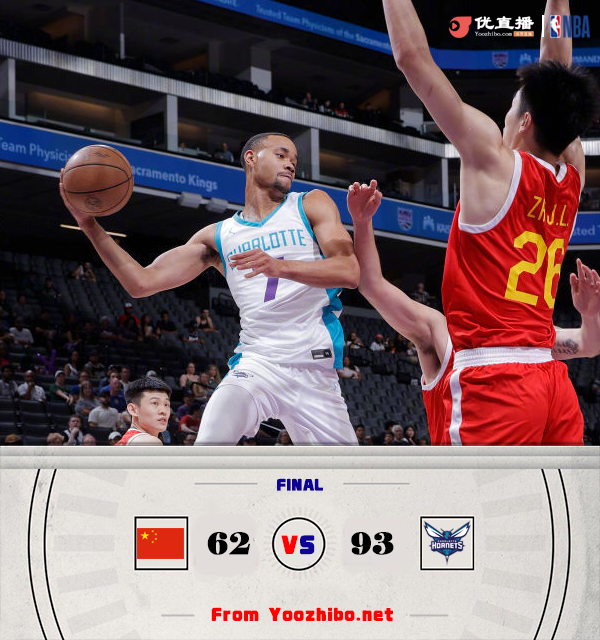 优直播7月8日讯 中国男篮今日迎来加州夏季联赛的第二个对手黄蜂,中国男篮上一场面对国王惨败51分。首节之争中国男篮慢热迟迟找不到感觉,杨瀚森开局进球是中国男篮前8分钟里唯一运动战进球,末段邹阳的三分是这一节为数不多的亮点,首节仅得9分的男篮早早就落后对手9分。次节男篮及时回暖以一波7-3开局蚕食比分,这一节虽然占不到太大的便宜但单节净胜1分状态上升并带着16分劣势进入下半场。休息归来高诗岩上来一记三分外加2+1带队送出10-2的攻势追至个位数,杨瀚森节中的梦幻脚步和隔扣相当亮眼;不过后半段男篮状态重新回落被对手频频打出反击导致分差重新被拉开;这之后男篮也很难制造威胁,杨瀚森末段连续制造犯规是为数不多的亮点。最终,黄蜂79-57送中国男篮夏联两连败。