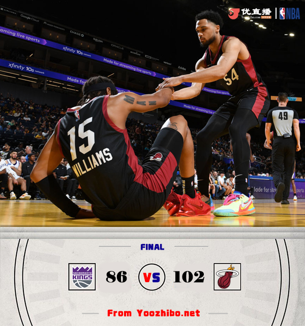 优直播讯 7月8日讯 NBA夏季联赛加州经典赛,热火对阵国王。一开场,热火率先发力打出7-1的开局,国王不断冲击篮筐频频得手很快完成反超,此后双方陷入缠斗,比分交替领先,热火持续发力打出12-3的攻击波占据主动,国王连投带罚努力追赶,斯尼德造成三分犯规三罚全中后分差仅剩3分,但斯威德内外开花连得10分帮助热火56-44领先国王结束上半场。下半场,两队围绕10分分差展开拉锯战,热火不断强攻内线拿分,国王连中三分咬住,末节国王奋力反击缩小分差,热火稳扎稳打保持优势。最终,热火102-86力克国王,取得胜利。