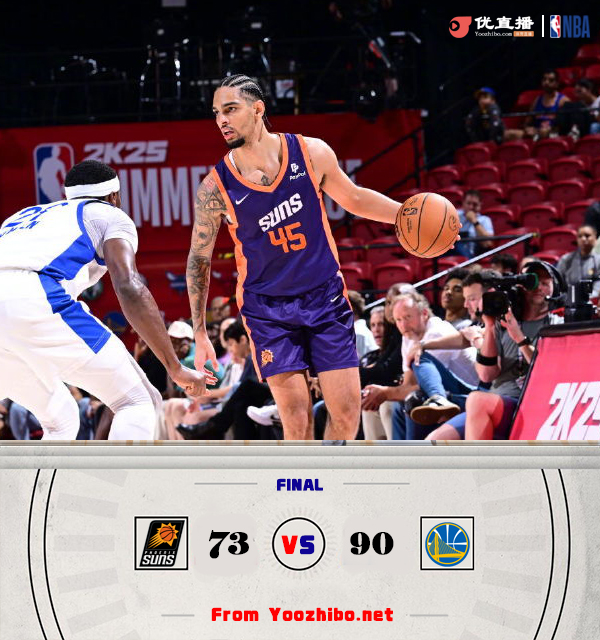优直播讯 7月14日 NBA夏季联赛继续开打,太阳和勇士迎来一场交手,勇士方面仍然派出波杰姆斯基和戴维斯的“老带新”阵容,太阳则是新援罗迪带队。首节勇士在和太阳短暂纠缠后迅速接管比赛,后半段几乎弹无虚发轰出21-4的攻势直接拉开两位数分差;次节勇士虽然进攻端不如首节,但他们让对手5分钟里仅得5分的防守非常成功,这一节稳定的防守帮助他们取得17分的优势进入下半场。休息归来太阳虽然进攻端稍有回暖但依旧无法阻止对手,勇士第三节首发5人里4人得分上双完全控制着比赛节奏,末节分差拉大至20分以上后比赛也彻底失去悬念。最终,勇士轻取太阳拿下比赛。