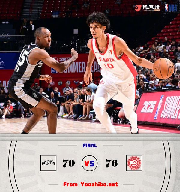 优直播 7月15日讯 NBA夏季联赛,马刺今日对阵老鹰,前者取得两连胜,后者上场比赛则是输给了奇才,此役马刺4号秀卡斯尔缺战。比赛上来,两队短暂拉锯后马刺打出一波10-0的小高潮将分差拉开到两位数,但之后的两分钟时间里他们一分未得,老鹰连拿七分追了回来,次节双方继续保持拉锯,半场结束时马刺落后1分;下半场回来,两队依旧是打得难解难分,比赛悬念保持到了最后,关键时刻威廉姆斯利用破紧逼的机会拿到两分,随后马刺采用犯规战术不给老鹰绝平机会,最终马刺险胜老鹰,迎来三连胜。