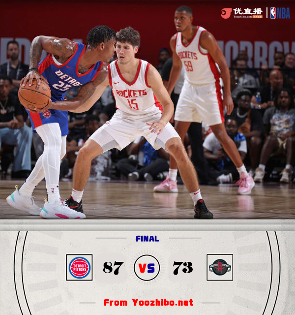 优直播 7月16日讯 NBA夏季联赛,火箭主场对阵活塞。比赛开始,双方进攻端都比较慢热,谢泼德上篮为火箭开局,双方打了半节各自仅得6分,随后火箭抓住机会一波9-0小高潮反超比分,首节火箭领先3分,次节双方还是找不到进攻状态,惠特摩尔还是没有运动战进球,双方展开拉锯战,丹尼斯-詹金斯里突外投扛起活塞进攻,半场活塞反超1分。下半场,双方进攻端终于找回状态展开拉锯战,37号秀克林特曼接连取分,而AJ-格里芬也找到手感单节砍下9分回应,惠特摩尔终于有运动战进球,三节火箭反超1分,末节活塞上来12-0直接建立主动权,打了半节谢泼德罚篮终于破荒,随后双方又接连打铁,活塞还是能掌握住双位数领先,最终活塞87-73力克火箭。