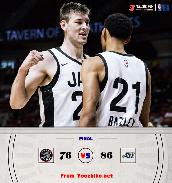 优直播7月17日讯 NBA夏季联赛,爵士主场对阵猛龙。爵士选秀大会上主要摘得10号秀科迪-威廉姆斯、29号秀科利尔和32号秀菲利波夫斯基;猛龙则是19顺位选中沃尔特,31顺位选中莫格博,45顺位拿到谢德。比赛开始,爵士上来比较慢热,猛龙抓住机会打出7-0开局,亨德里克斯里突外投止血,随后2分钟内猛龙再打10-0建立主动权,亨德里克斯又是连追5分,首节爵士仅落后2分,次节猛龙打了3分多钟仅得2分,爵士一波小高潮反超比分,随后爵士接连外线发炮,单节23-10直接领先到11分。下半场,菲利波夫斯基接连取分,亨德里克斯继续保持自己的好状态,而猛龙则是利伯蒂苦苦支撑,三节爵士领先到17分,末节双方展开拉锯战,猛龙后半节一波9-0追至个位数分差,金西暴扣止血,爵士还是掌握住10分左右领先,最终爵士86-76力克猛龙。