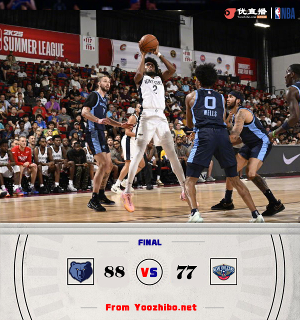 优直播讯7月18日讯 NBA夏季联赛,鹈鹕主场迎战灰熊。鹈鹕选秀大会上主要选中21号秀米西、47号秀里夫斯和52号秀马特科维奇;而灰熊则是摘得9号秀埃迪、39号秀韦尔斯和53号秀斯潘塞。比赛开始,鹈鹕上来就接连外线命中三分,而灰熊则是靠9号秀埃迪连续内线打成并送暴扣回应,双方展开对攻拉锯战,比分拉不开,双方首节打成25平,次节双方命中率都有下降,小皮蓬又攻又传带领灰熊咬住比分,而鹈鹕则是靠霍金斯和福特撑起进攻,埃迪盖帽时扭伤脚踝,半场双方继续打成43平。下半场,小皮蓬上来接连推反击送助攻,带领灰熊一波12-3攻击波一举拉开双位数领先,鹈鹕接连冲击内线打成2+1止血,三节灰熊领先到7分,末节双方展开拉锯战,雅罗接连外线扔进三分,灰熊顺势一波7-0重新拉开双位数领先,最终灰熊88-77力克鹈鹕。