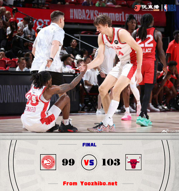 优直播 7月20日讯 NBA夏季联赛,老鹰对阵公牛。选秀大会上老鹰摘得状元秀里萨谢,而公牛拿到11号秀布泽利斯。本场比赛里萨谢缺阵。比赛开始,公牛率先发力打出9-2开局,随后老鹰接连三分追分,斯图尔特手感火热外线能给出回应拉开双位数领先,首节公牛领先7分,次节双方展开拉锯战,菲利普斯接连扔进三分,公牛越打越好,一波10-3领先到15分。下半场,双方你来我往,公牛还是保持十几分领先,温德勒里突外投连砍6分带领老鹰一波8-2追至个位数分差,三节公牛还领先8分,末节老鹰开始追分,鲍登成为替补奇兵,老鹰9-0一度反超比分,但斯图尔特接连三分止血,双方展开胶着拉锯战,关键时刻华莱士和鲍登又接连扔三分反超2分,斯图尔特两罚再追平,双方96平进入加时。加时赛率先得到7分的球队获胜,菲利普斯三分命中后温德勒迅速回应,布泽利斯两罚后斯图尔特抛投绝杀,最终公牛加时103-99险胜老鹰。