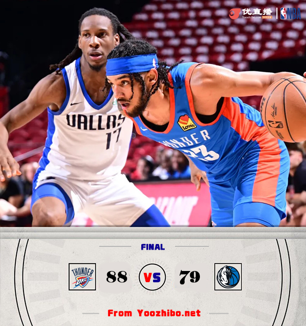 优直播 7月21日讯 NBA夏季联赛,雷霆对阵独行侠。雷霆选秀大会上摘到12号秀托皮奇、26号秀琼斯和38号秀米切尔。比赛开始,双方进入状态都不快,打了3分多钟各自仅拿到4分,威利接连内线打成帮助独行侠一波10-0进攻波一举确立领先,但雷霆接连造杀伤回应9-2追到差4分,次节双方你来我往展开拉锯战,雷霆多次追平比分但独行侠都能回应,双方次节打成22平,半场独行侠还领先4分。下半场双方上来接连打铁,凯利暴扣打破僵局,劳森反击立马回应,随后独行侠突陷得分荒,最后两分钟雷霆一波15-3攻击波一举反超9分,末节伯海姆三分助雷霆领先双位数,双方围绕10分左右分差展开拉锯战,普罗斯珀三分追到差5分,但独行侠连续失误,最终雷霆88-79力克独行侠。