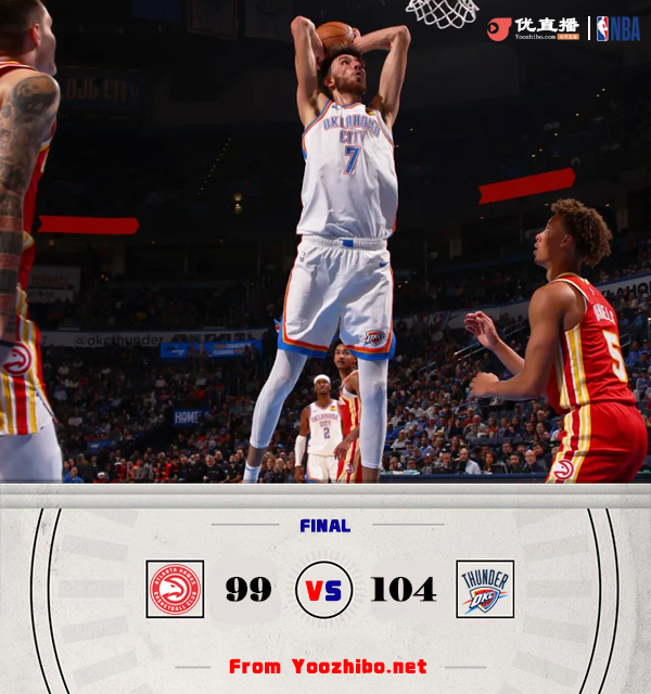 优直播10月18日讯 NBA季前赛,老鹰对阵雷霆,本场比赛老鹰主力休战,雷霆则是亚历山大和杰伦-威廉姆斯领衔先发。比赛开场后雷霆多点开花取得领先,并且一度领先到两位数老鹰依靠三分追赶比分,首节后半段雷霆命中率下降,老鹰冲击内线完成反超,巴夫金状态火热接连拿分。第二节雷霆上来打出一波11-0的攻势夺回另外,随后老鹰连续拿分做出回应,杰伦-威廉姆斯崴脚离场,两队你来我往陷入僵持。下半场回来雷霆也主要安排替补阵容出战,场上局面依旧十分胶着。最后一节两队依旧是拉锯战,雷霆始终保持微弱优势,老鹰最后采用犯规战术也未能上演奇迹,最终雷霆104-99力克老鹰。