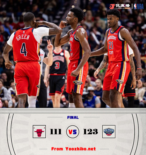 优直播10月24日讯 NBA常规赛全面开打,鹈鹕首战主场面对公牛,此役鲍尔时隔1013天重返常规赛赛场。比赛开打后双方稍显慢热,短暂试探后鹈鹕开始发力,英格拉姆联手麦科勒姆接连取分,首节结束时鹈鹕领先4分,次节回来,拉文手感爆棚单节飚中4记三分,公牛稳扎稳打一度反超,末段两队你来我往陷入僵持,半场战罢,鹈鹕保有1分优势。易边再战后公牛进攻再次出现停滞,麦科勒姆里突外投不断打进,鹈鹕一波13-3再次拉开比分,琼斯压哨三分命中,三节结束后鹈鹕将优势扩大到15分,末节上来,公牛始终无法打出追分高潮,比赛提前失去悬念,最终鹈鹕123-111击败对手迎来开门红。