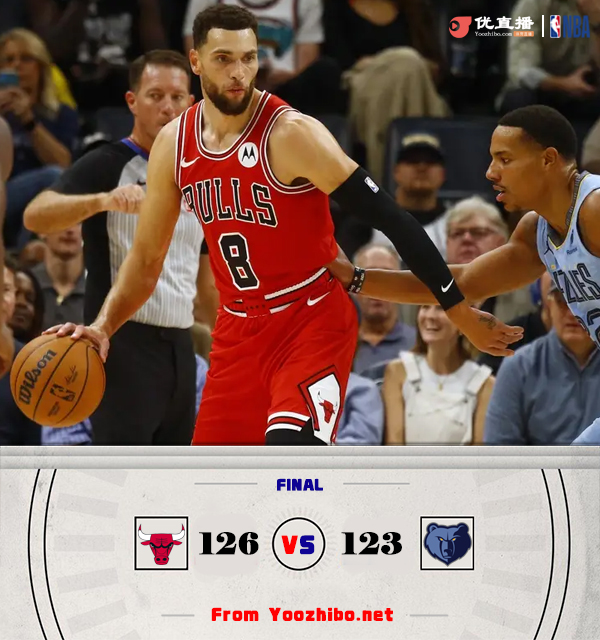 优直播10月29日讯 NBA常规赛,灰熊主场迎战公牛。上半场,灰熊率先发力,多点开花很快取得两位数领先,次节双方大打对攻,公牛内外开花连续拿分,灰熊不断冲  击篮迅速回应,半场战罢灰熊68-54领先公牛。下半场,双方依旧火力很猛,公牛外线发力连中三分不断缩小分差,末节灰熊命中率下降,公牛持续输出反超比分,灰熊苦苦追赶无果。最终,公牛126-123力克灰熊。
