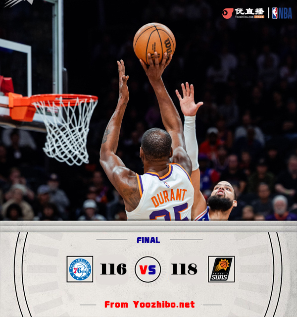 优直播讯11月5日讯 NBA常规赛,太阳今日迎战76人,前者近来状态不错取得四连胜,后者则是遭遇两连败,此役乔治复出迎来首秀。比赛上来,太阳率先发力利用一波8-0的小高潮将分差拉开到了两位数,不过之后他们的命中率有所下滑,76人在洛瑞的带领下逐渐追了回来,次节双方开始展开对攻,单节打出37-37的高比分,半场结束时太阳仅领先2分;下半场回来,两队依旧是打得难解难分,分差一直没能再拉开,在末节104-104平后76人连中三记三分球获得场上主动权,不过太阳没有放弃回敬8-0咬住比分,关键时刻杜兰特上篮反超,马克西绝杀三分不中,最终太阳险胜76人迎来五连胜。