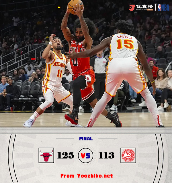 优直播11月10日讯 NBA常规赛,公牛对阵老鹰,公牛最近遭遇4连败,老鹰上场比赛惜败活塞。开场后老鹰在特雷-杨的带领下首先打出攻势,特雷-杨自己出手不多但连连为队友送出精彩助攻,卡佩拉在内线也是表现相当活跃,公牛主要依靠拉文和武切维奇的单打追分。第二节回来两队手感都不错,连续在外线对飚三分,公牛虽然多点开花,但老鹰进攻也相当犀利没有给公牛缩小分差的机会,其中杰伦-约翰逊状态火热频频砍分。易边再战,老鹰延续状态以7-0开局,公牛经过暂停调整连续用三分稳住阵脚,第四节上来老鹰进攻断电,公牛趁势追击一波14-3的反扑完成反超,特雷-杨和杰伦-约翰逊凭借个人能力进攻也未能奏效,反倒是拉文和怀特关键时刻表现硬气先后拿分帮助公牛锁定胜局,最终公牛125-113逆转老鹰结束4连败,老鹰遭遇2连败。