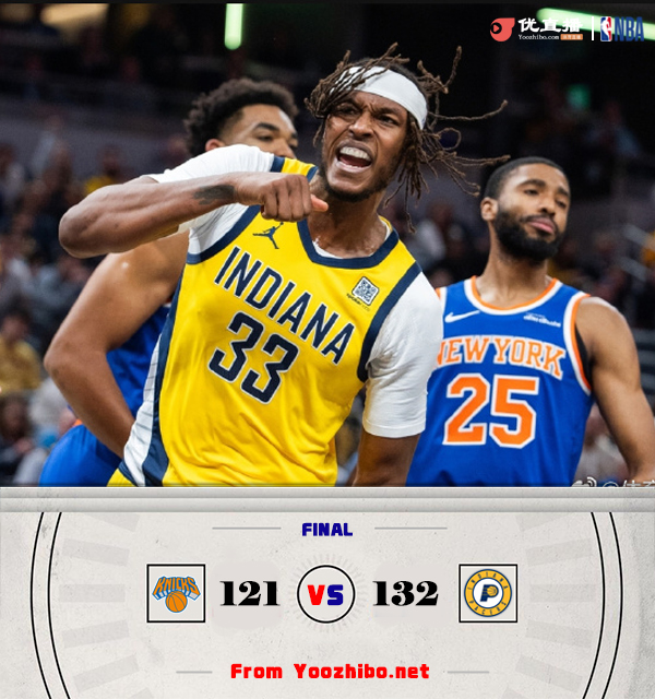 优直播11月11日讯 NBA常规赛,步行者主场迎战尼克斯。目前步行者4胜5负,尼克斯4胜4负。比赛开始,双方迅速进入状态展开对攻,哈利伯顿继续组织进攻,马瑟林连续3记三分命中,但尼克斯首发五虎也能给出回应,首节步行者领先3分,次节阿努诺比里突外投反超比分,双方展开拉锯战,哈利伯顿和布伦森展开对飚,马瑟林继续出色状态接连三分追分,半场尼克斯反超3分。下半场,唐斯打得很强硬,尼克斯一波10-0建立主动权,随后沃克连续三分一度反超,好在哈特连续突破止血,三节尼克斯依然领先2分,末节双方展开拉锯战,哈利伯顿联手马瑟林帮助步行者反超比分,随后步行者下起三分雨直接拉开双位数领先,最终步行者132-121力克尼克斯。