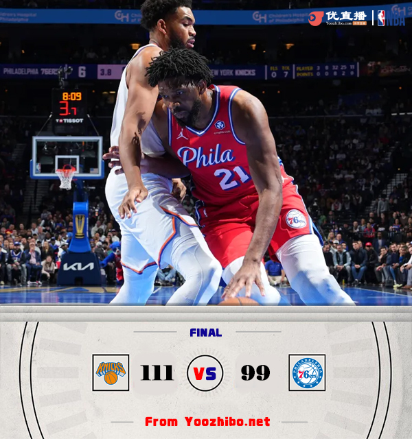优直播11月13日讯 NBA东部NBA杯A组,76人主场迎战尼克斯。此役76人球星恩比德迎来赛季首秀。比赛开始,尼克斯多点开花占据主动,尼克斯内外开花迅速迫近比分,次节双方继续缠斗,乔治攻防两端立功,恩比德连续造成杀伤,尼克斯多点开花强势回应,半场战罢尼克斯54-50领先76人。易边再战,布伦森崴脚一度返回更衣室,恩比德飙中三分,尼克斯持续发力取得领先,76人连投带罚迅速追赶,末节尼克斯持续发力打出11-0取得两位数领先,76人苦苦追赶无果。最终,76人99-111不敌尼克斯,主场落败。