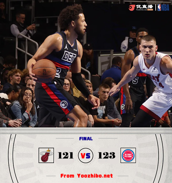 优直播11月13日讯 NBA东部NBA杯B组,活塞主场迎战热火,本场比赛巴特勒因伤缺阵。比赛开始,热火首发极其不在状态,活塞上来就打出10-0梦幻开局,随后热火替补开始追分,但约维奇意外受伤流血离场,哈里斯手感不错带领活塞能回应,首节活塞领先11分,次节活塞上来又是7-0拉大领先,随后热火外线多点开花连中4记三分一度反超比分,但康宁汉姆接连送妙传助队半场稳住6分领先。下半场,双方展开拉锯战,小哈达威又受伤流血离场,但康宁汉姆有攻有传,活塞接连三分命中还是领先到9分,末节双方围绕着10分左右分差再次展开拉锯战,最后时刻希罗接连3记三分直接将比赛拖入加时。加时赛,双方继续拉锯战,杜伦两罚不中后热火领先到3分,但比斯利三分再追平,希罗准绝杀后被杜伦空接暴扣扳平,热火没暂停但斯波进场喊暂停被吹T,最终热火加时121-123惜败活塞。