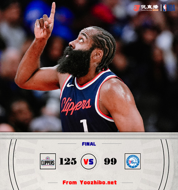 优直播讯北京时间11月25日讯 NBA常规赛,快船对阵76人,快船最近状态不错取得4连胜,76人上场比赛击败篮网,恩比德和乔治继续缺阵。开场后快船在哈登的带领下内外开花早早建立起两位数优势,哈登手感不错单节轰下12分,76人开局手感不佳到了第一节后半段才逐渐找到手感。第二节快船进攻命中率也开始下降,主要是哈登手感下降,两队单节打成平手。易边再战,哈登再度带领快船打出攻势将分差拉大,场上分差一度达到33分。76人虽然再度后程发力追回一些分数,但第四节快船再度掌控场上局面,最终快船125-99轻取76人收获5连胜。