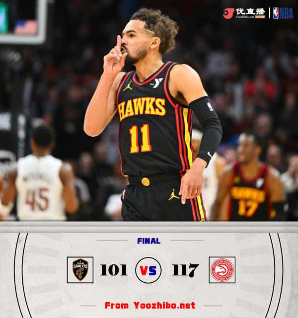 优直播讯11月30日讯 NBA杯,老鹰回到主场再战骑士,前天常规赛两队在克利夫兰有过交手,老鹰11分优势获胜,本场比赛勒韦尔复出。比赛开始,双方迅速进入状态,加兰接连三分助队一波10-2小高潮建立主动权,但老鹰马上回应7-0后,亨特里突外投连续砍分,老鹰接连三分首节反超2分,次节米切尔继续不开和,双方进攻端命中率都不高,亨特接连三分再中,老鹰拉开双位数领先,米切尔和加兰连中4记三分止血,半场骑士继续落后2分。下半场,米切尔还是手感一般,老鹰接连杀内线重新拉开双位数领先,勒韦尔接连三分止颓,但老鹰替补打出12-2攻击波一度拉开20分以上领先,末节双方对攻,加兰带队苦苦追分,但老鹰全民皆兵回应,分差始终保持在十几分,最终老鹰117-101再胜骑士。